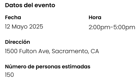 - Evento: Fecha, Hora, Dirección, Personas