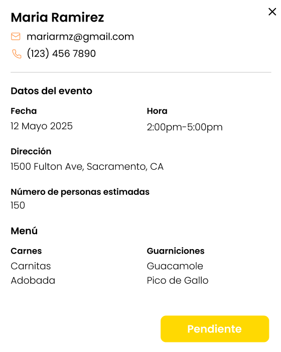 Pantalla: Modal con datos del cliente, datos del evento, menú seleccionado y selector/botón de estatus.