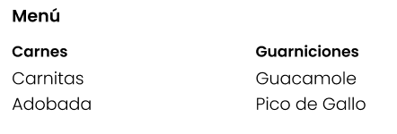 - Menú: selecciones de carnes y guarniciones