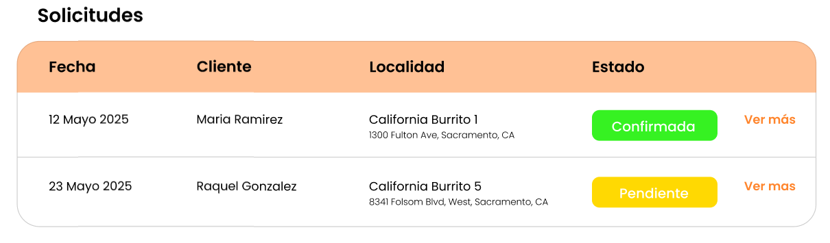 Pantalla: Tabla de solicitudes con filtros por Estado y Rango de fechas, columnas (Fecha, Cliente, Localidad, Estado) y botón “Ver más”.
