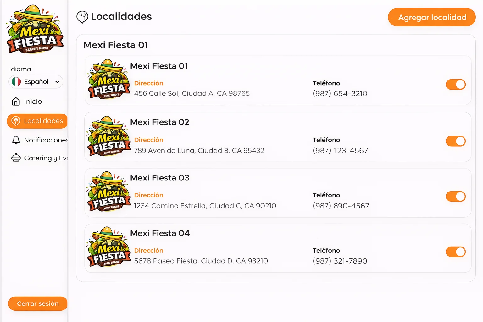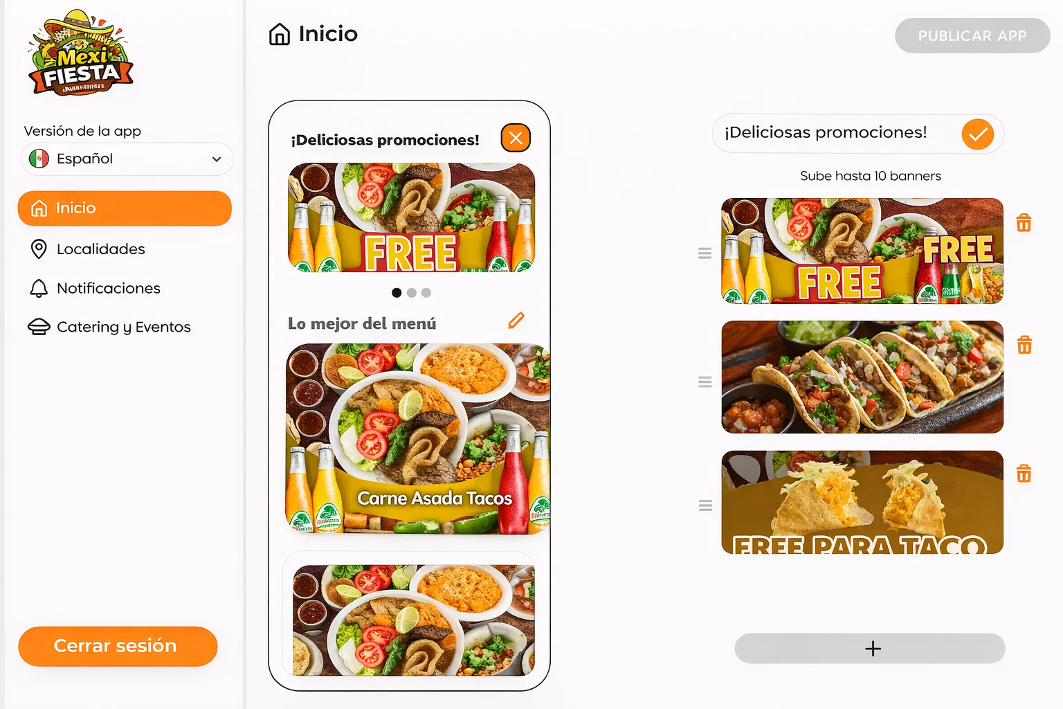 Desde el dashboard se pueden administrar secciones como Home, Localidades, Horarios, Redes sociales, Menú, Catering y Eventos y Notificaciones.