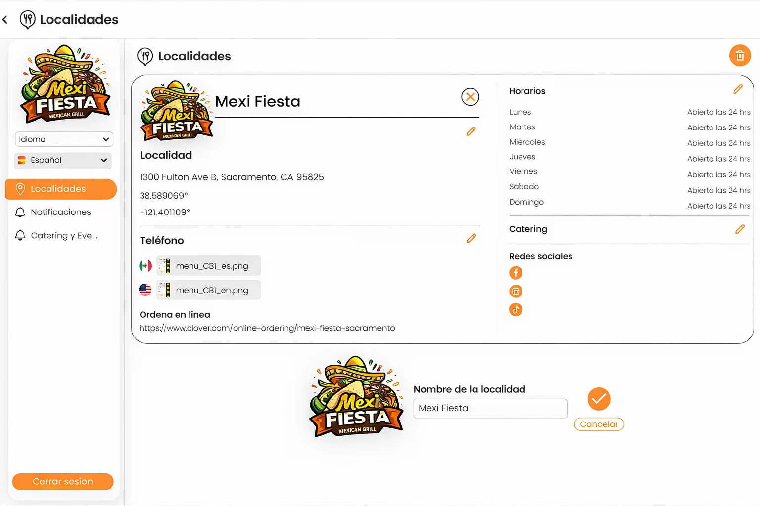 Pantallas: Editor por secciones: Nombre/Logo, Dirección + coordenadas, Teléfono, Menú > Ordena en línea (URL), accesos a Redes sociales y Catering y Eventos.
