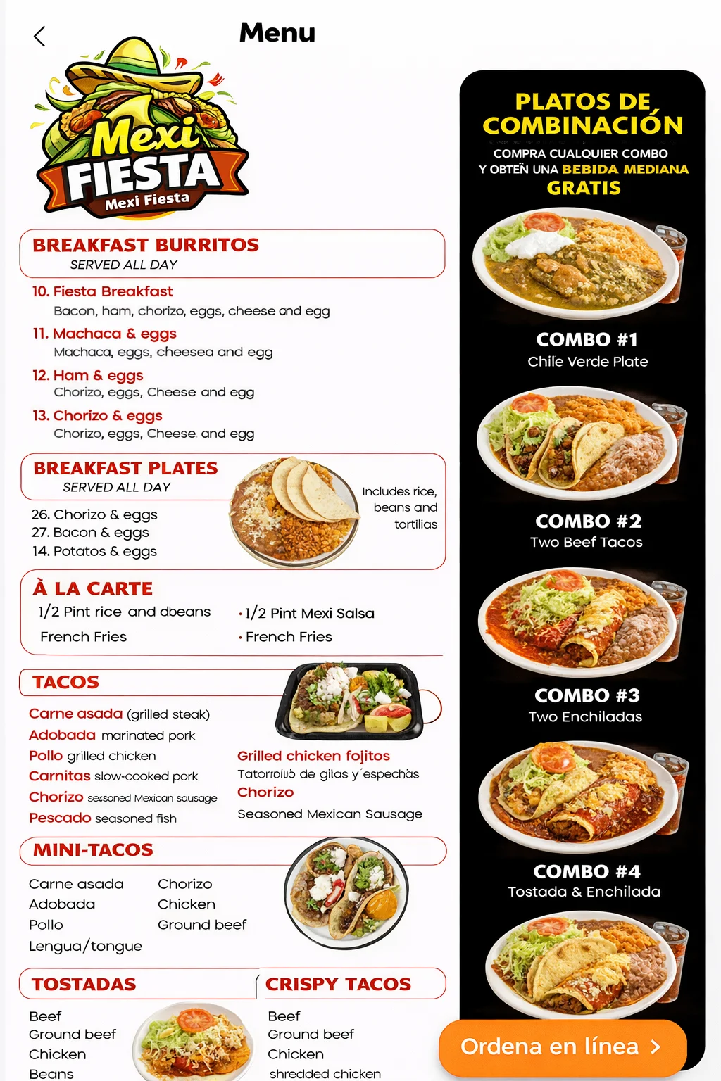 Pantalla: Imagen/menú y botón “Ordena en línea”.