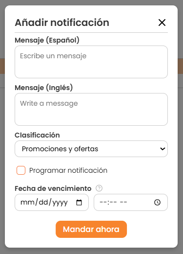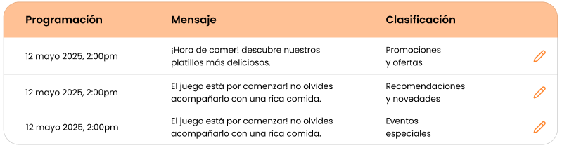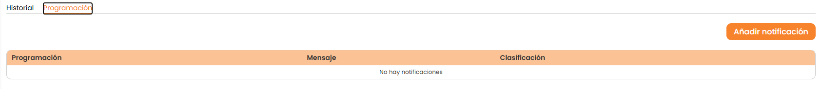 Pantalla: Pestaña “Programación” con lista de notificaciones programadas y botón “Añadir notificación”.