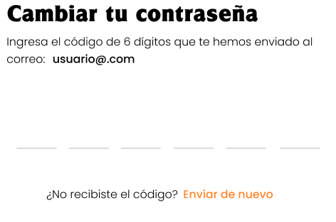 Pantallas: “Cambiar tu contraseña” (email + nueva contraseña) y pantalla para ingresar código de 6 dígitos con opción “Enviar de nuevo”.