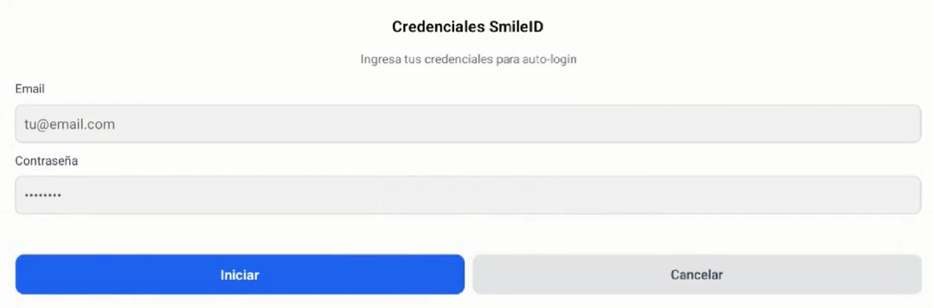 Sin embargo, si se selecciona la opción “Abrir en Smile ID”, aparecerá un modal donde será necesario ingresar nuevamente las credenciales de la localidad.