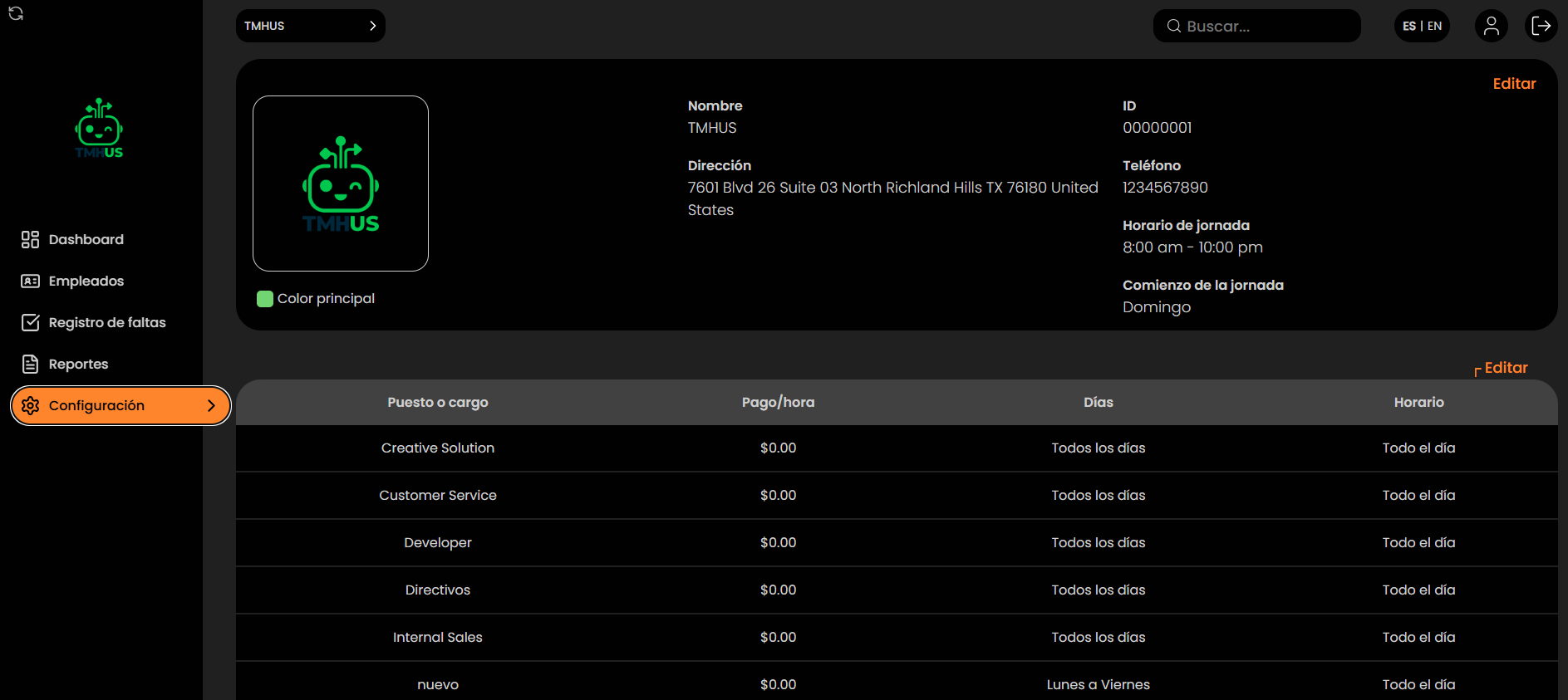 Aquí ajustas datos generales de la localidad/sucursal y reglas por puesto (pago/hora, días y horarios).