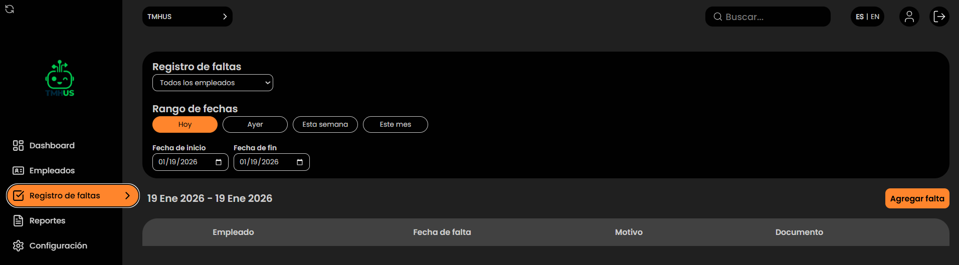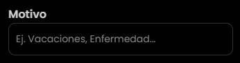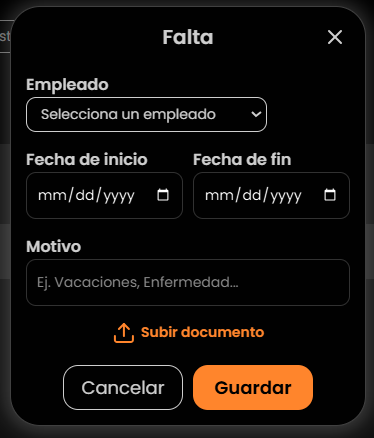 Aquí registras ausencias con motivo y documento (opcional), con vista para uno o varios empleados.