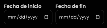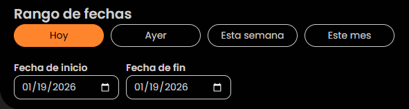 - Rango de fechas (Hoy/Ayer/Esta semana/Este mes + fechas manuales)