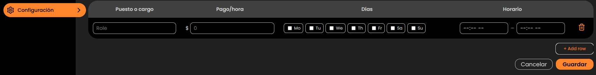 En esta sección puedes configurar los distintos roles o puestos de trabajo dentro del sistema, definiendo su pago y horario de manera flexible.